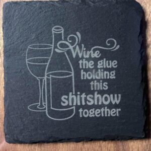 Wine is the glue holding this shit show together Slate Coaster. Laser engraved and forever visible.