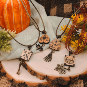 A collection of handmade wooden necklaces.