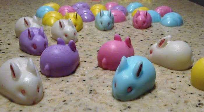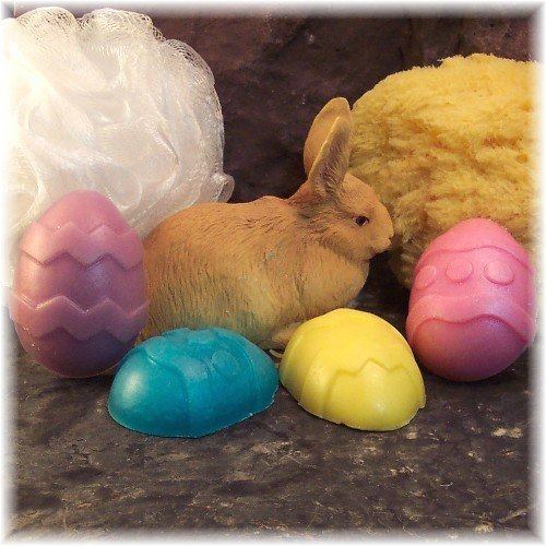 Sweet little Easter Spring themed soaps. Â So cute! Â Tiny bunnies and Easter Egg shaped soaps that are just delightful. You will receive a set of six assorted guest size soaps in assorted Spring colors of white, pink, purple, blue and yellow. Â The bunnies are accented by hand with soap to highlight the pink ears and eyes.