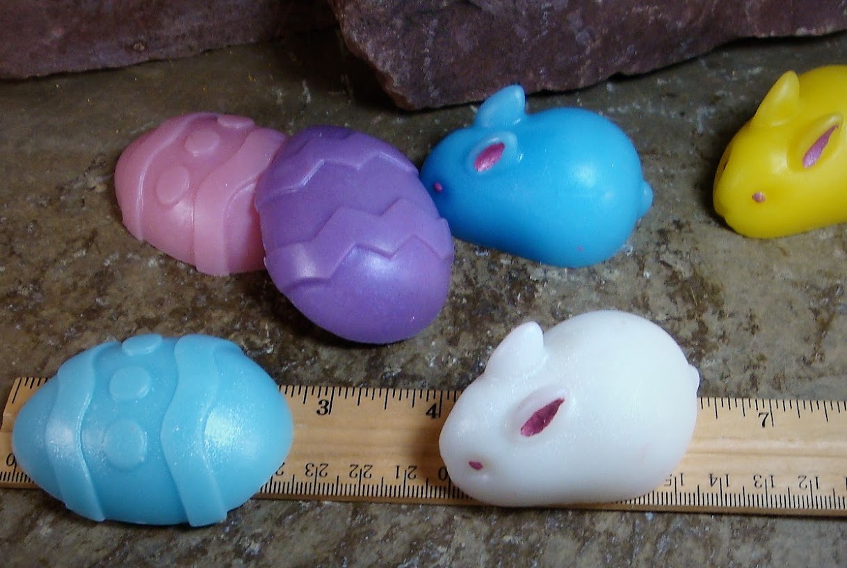 These soaps are small, measuring about 2 inches in size and weighing a little over an ounce each.  This listing is for 3 bunnies and 3 eggs in assorted colors. Â