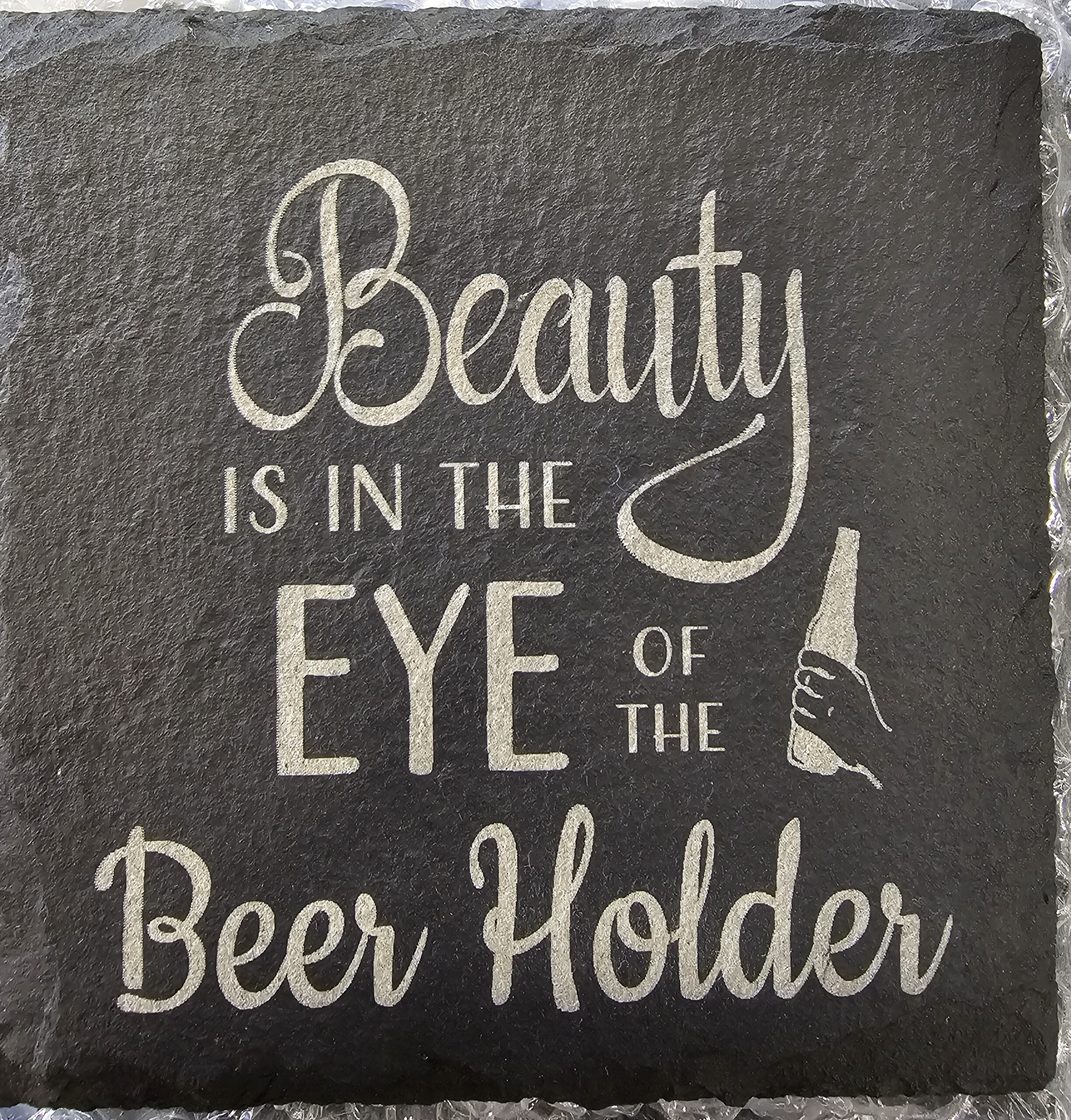 Beauty is in the eye of the beer holder Slate Coaster. Laser engraved and forever visible.