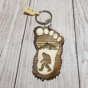 These Big Foot/ Sasquash inspired keychains are handmade from wood and crafted with various scenes. Keychain measures about 3.25 inches tall.Â