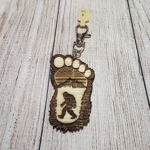 These Big Foot/ Sasquash inspired keychains are handmade from wood and crafted with various scenes. Keychain measures about 3.25 inches tall.Â