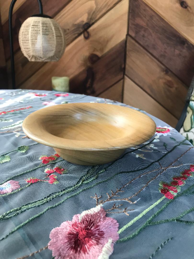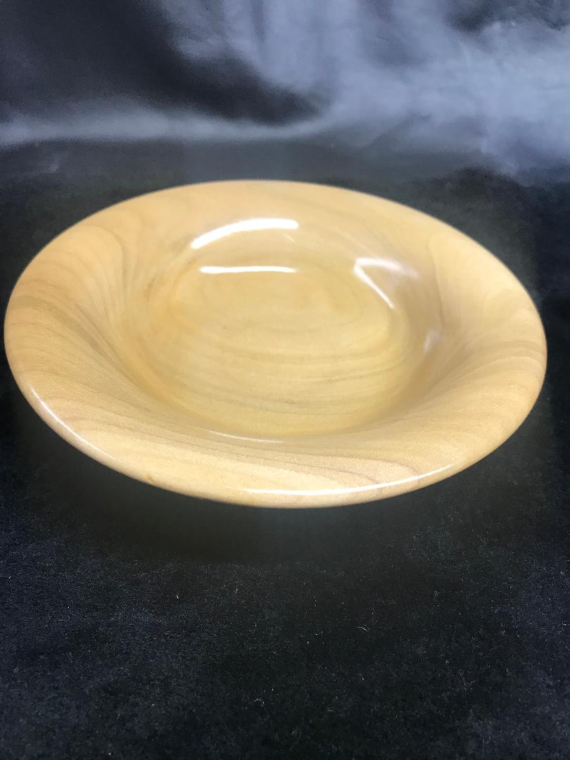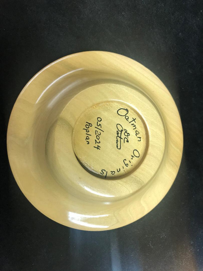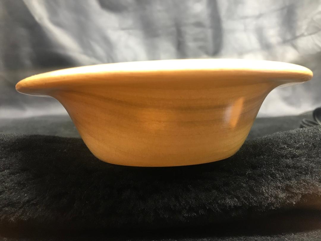This bowl was hand turned on a lathe. The wood is poplar which varies in color from a creamy white to a yellowish-brown to an olive green. Common uses are for furniture, cabinets and turnings.