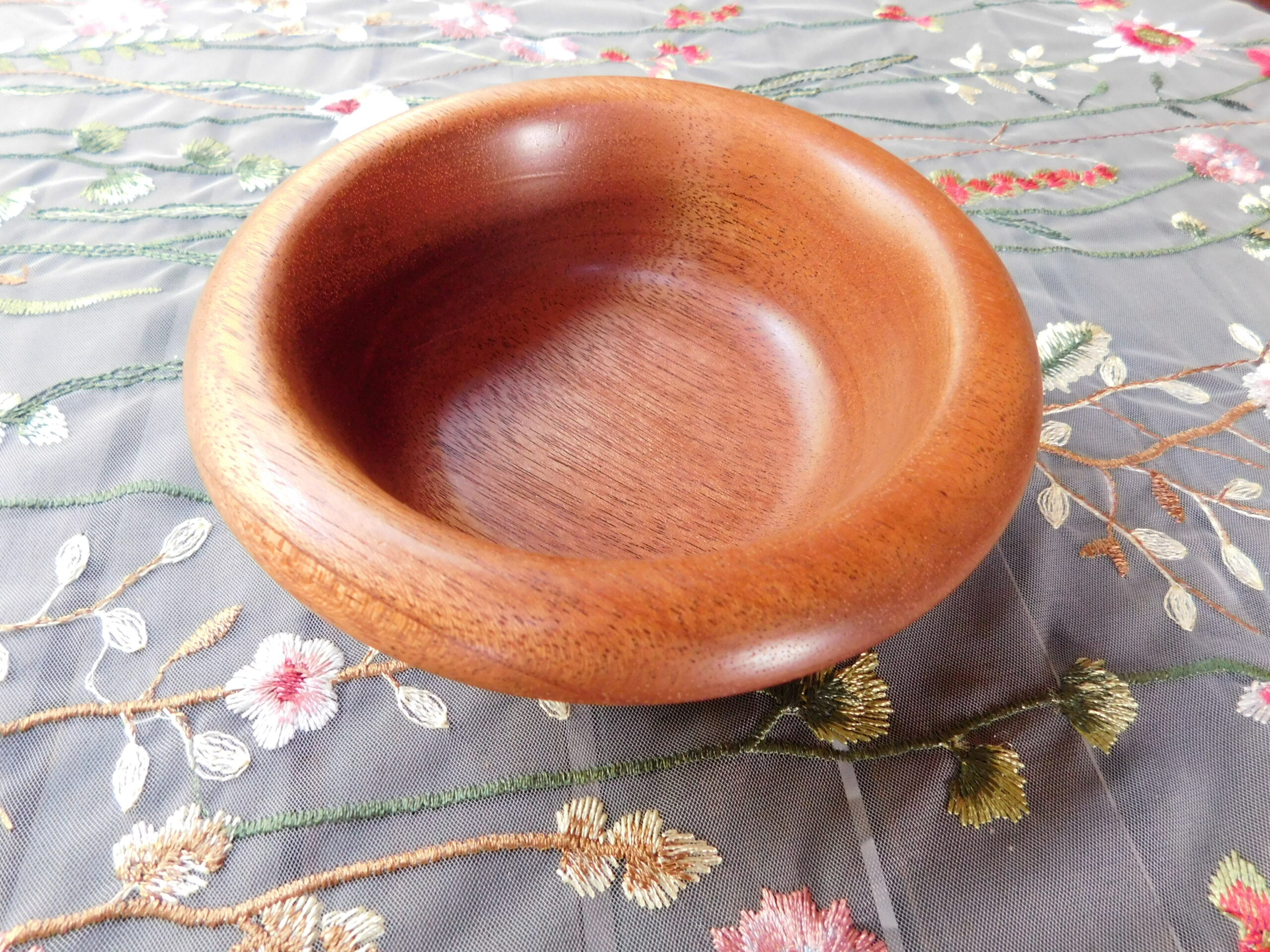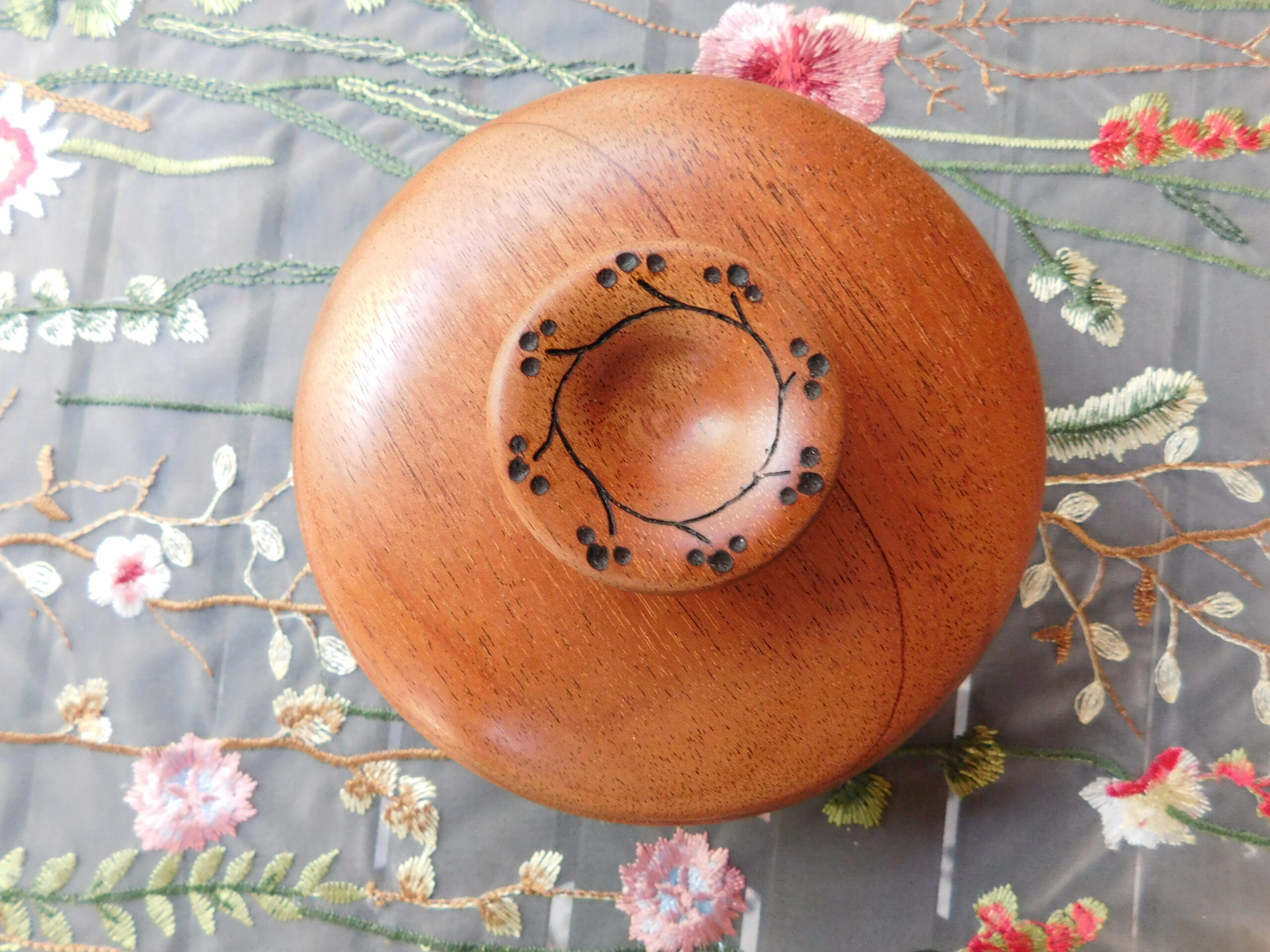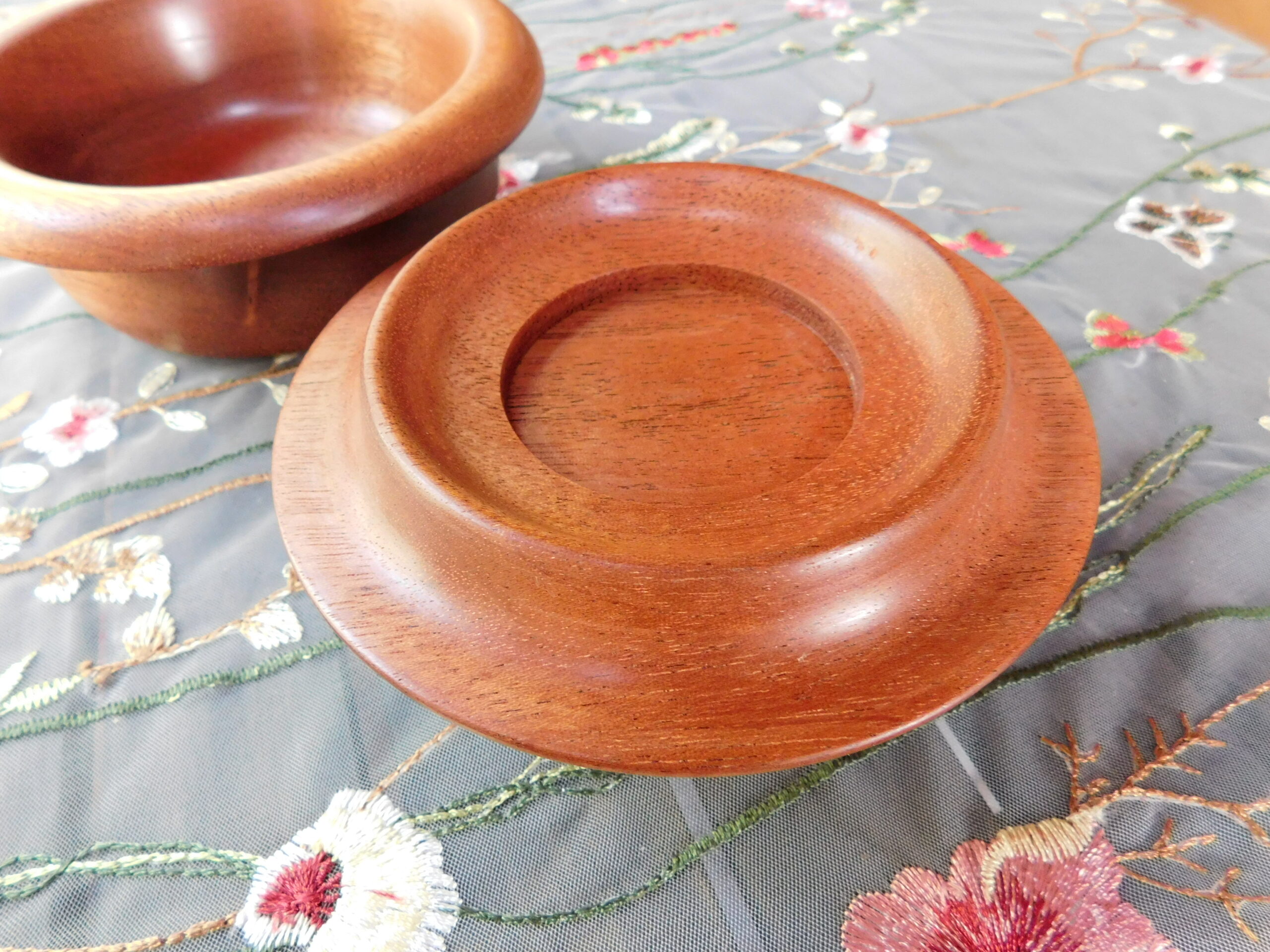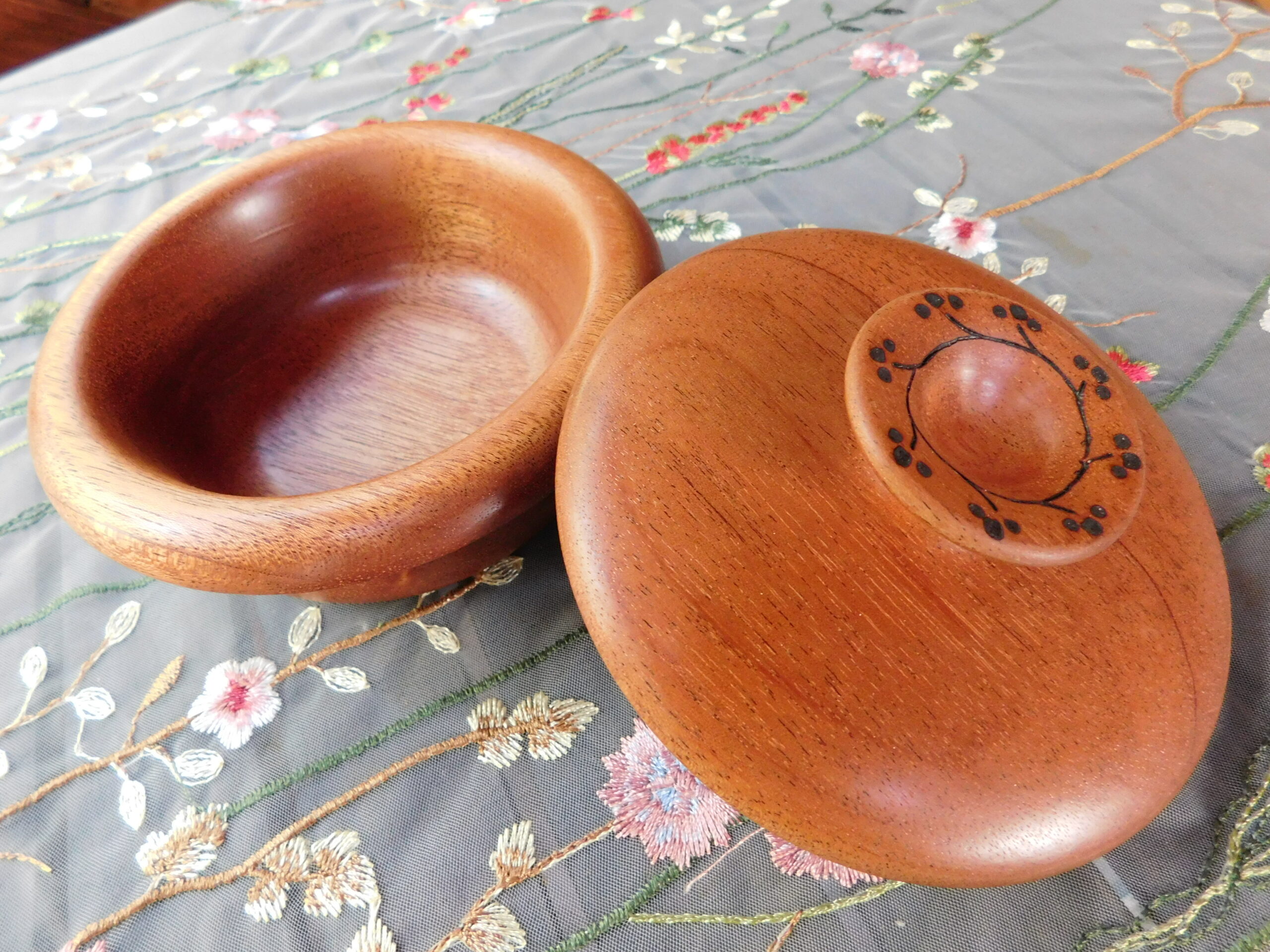 This lidded bowl is made of mahogany. It is 5-3/4″ wide by 3-1/4″ tall. The finish is a satin polyurethane.