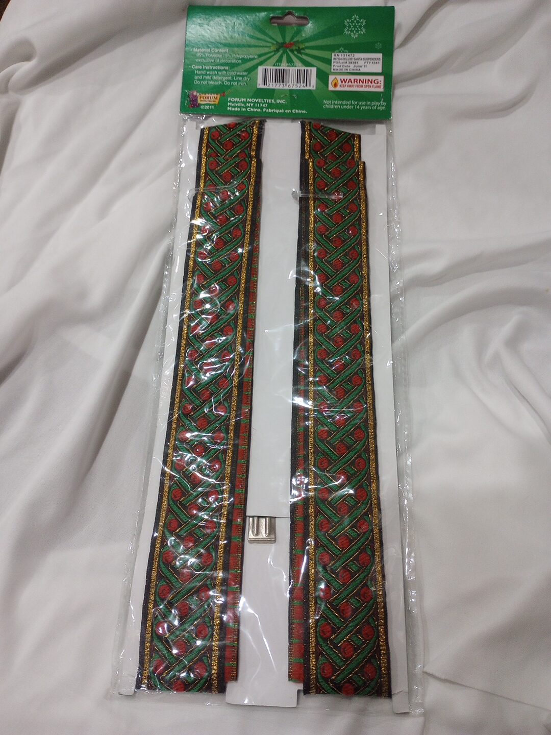 From Forum Novelties, these deluxe Santa suspenders are for adults. They are an one size fits all and go well with any Christmas or Santa themed outfit.
