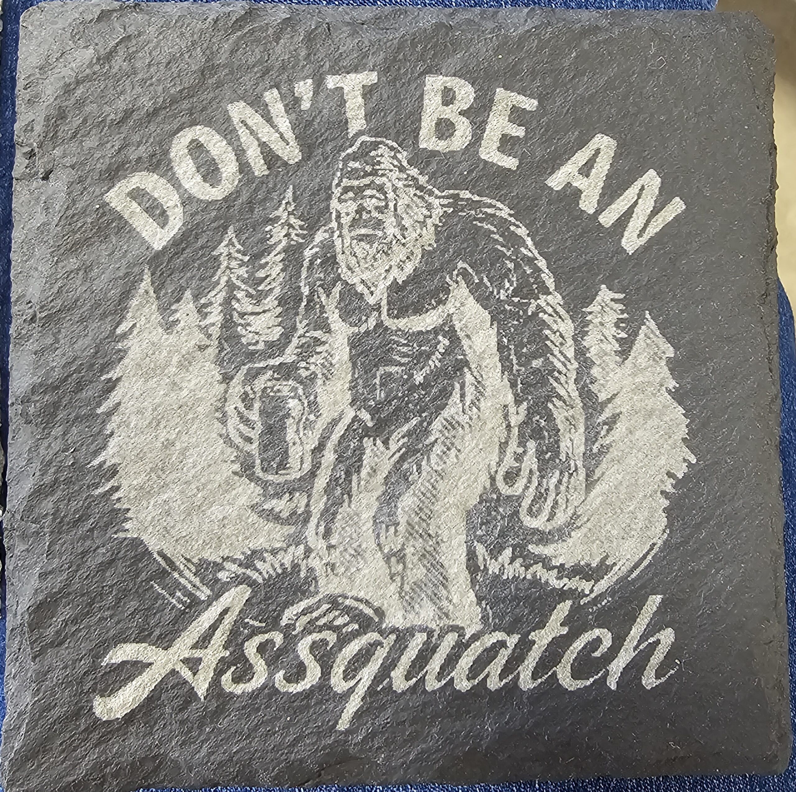 Dont be an assquatch Slate Coaster. Laser engraved and forever visible.
