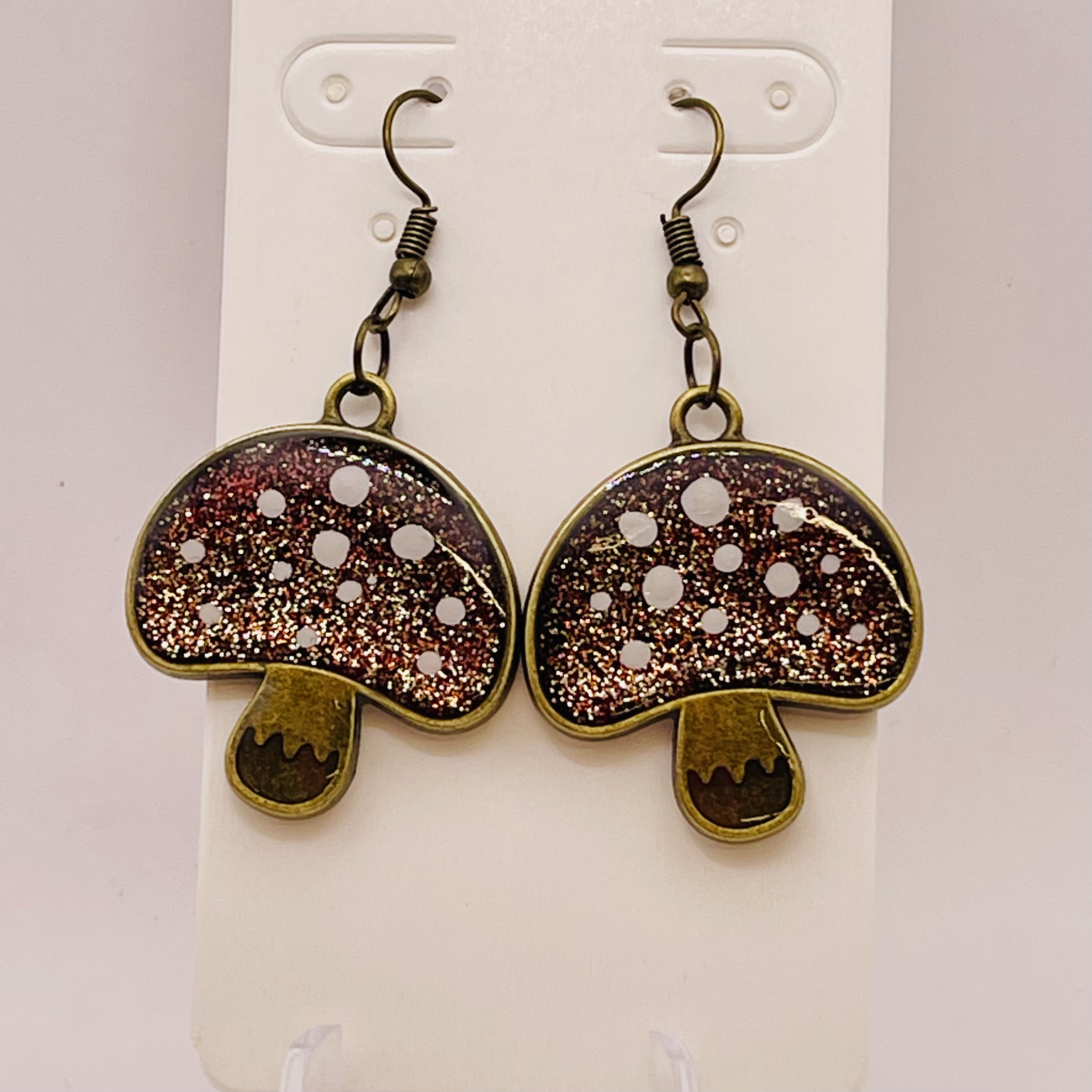 These cute mushroom earrings are handcrafted from bronze toned open backed bezels filed with glitter and resin, hand painted dots and sealed with another layer of resin. They hang approximately 2 inches.Ā