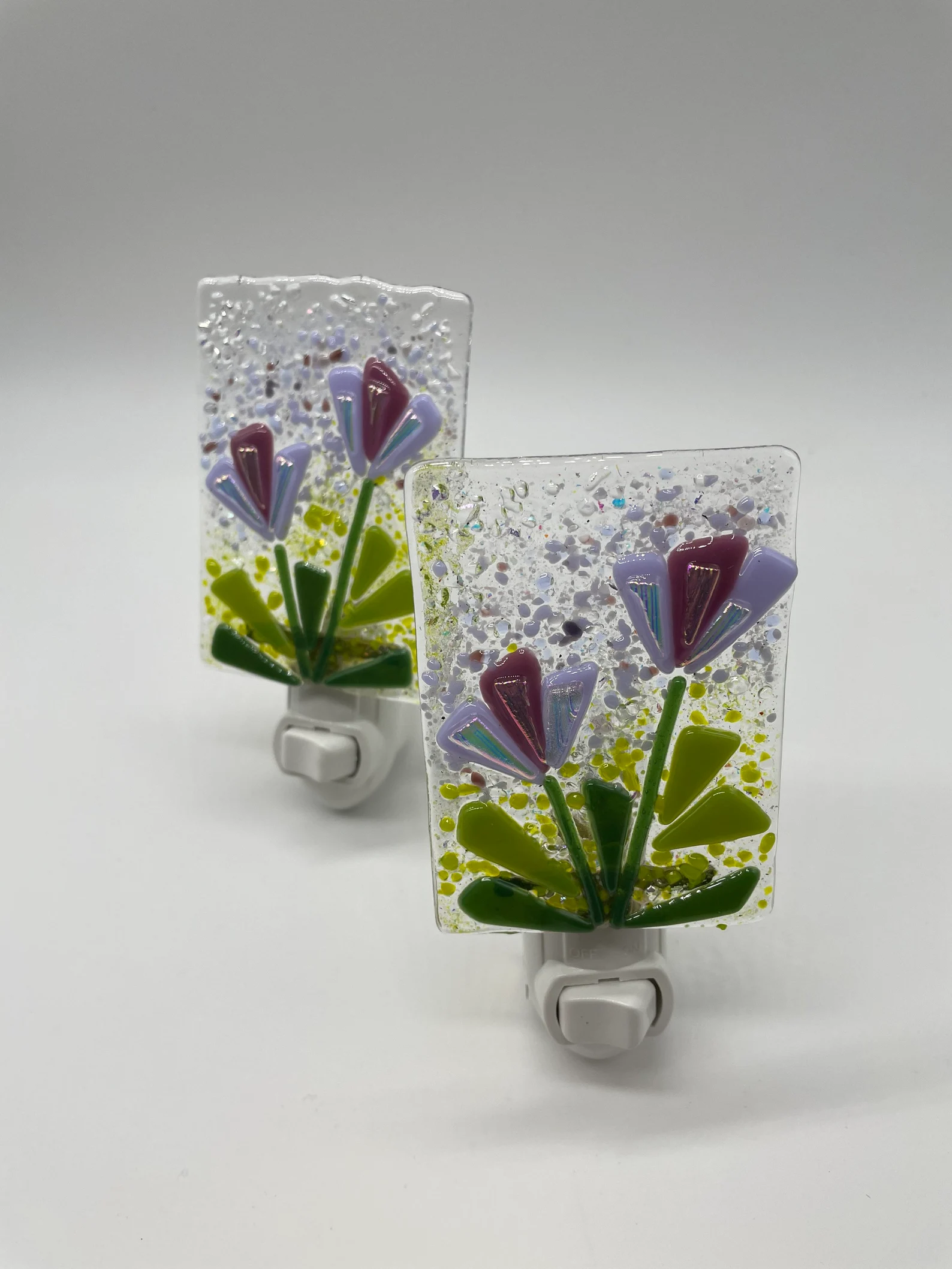 Hand made Fused Glass Night Light flower pattern in a variety of colors. 3 3/8”x 2 3/8”. Glass pad is glued to the night light hardware.