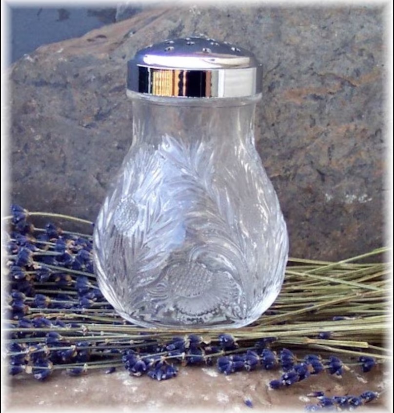 This classic style glass powder shaker comes with 8 oz. of my own blend of pure natural no talc dusting powder lightly scented with lavender and chamomile essential oils or unscented. I choose the ingredients of finely processed modified corn starch and arrowroot for their purity and the silky velvet feel.Â