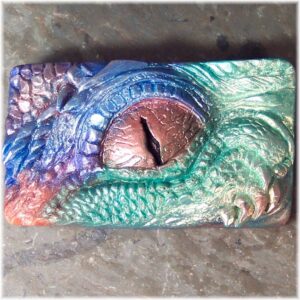Mythical dragon eye soap set of two bars brings a magical aura to your bath. These colorful soaps are created one at a time so every one is unique in its color placement. The dramatic style of the piercing eye of the dragon is highlighted with copper accents and the background is a blend of deep sapphire blues, and emerald greens. This soap is in a dramatic style that is elevated above the child like story book dragons and is fashioned to capture the majesty of this fascinating creature of mythology.