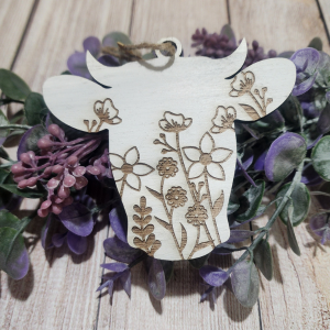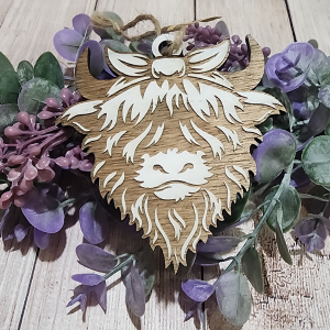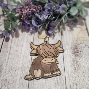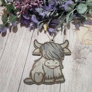 Handcrafted, wooden ornaments carved in various Highland Cow options. Each ornament is about 4 inches tall.