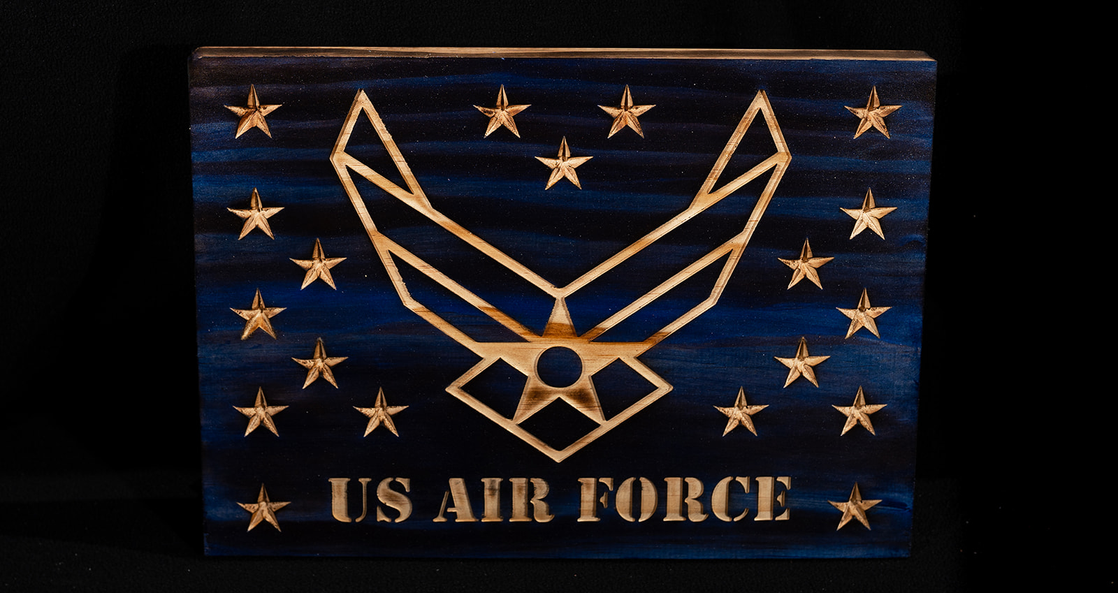 These handmade wooden flags are custom made for each order. Using both CNC routers, we can custom etch any logo into your 17×33 flag.