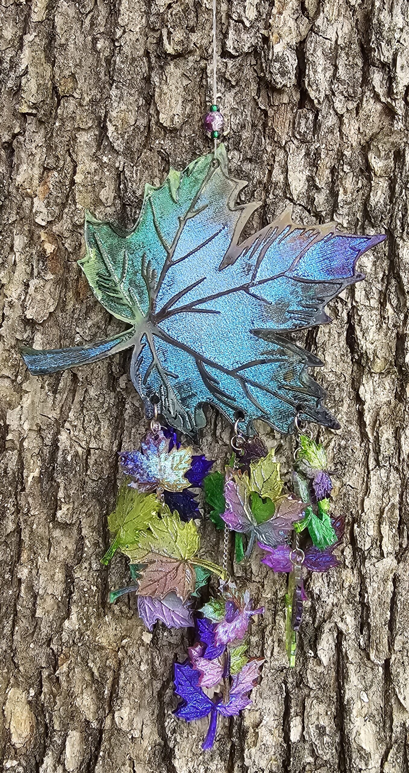 These maple leaves are custom cut acrylic and individually hand colored. Each set comes with 1 large leaf hanging from elastic cord with complimenting beads and minimum 10 mini leaves hanging from silver chains. With Hearts cut out of center of some leaves.Â
