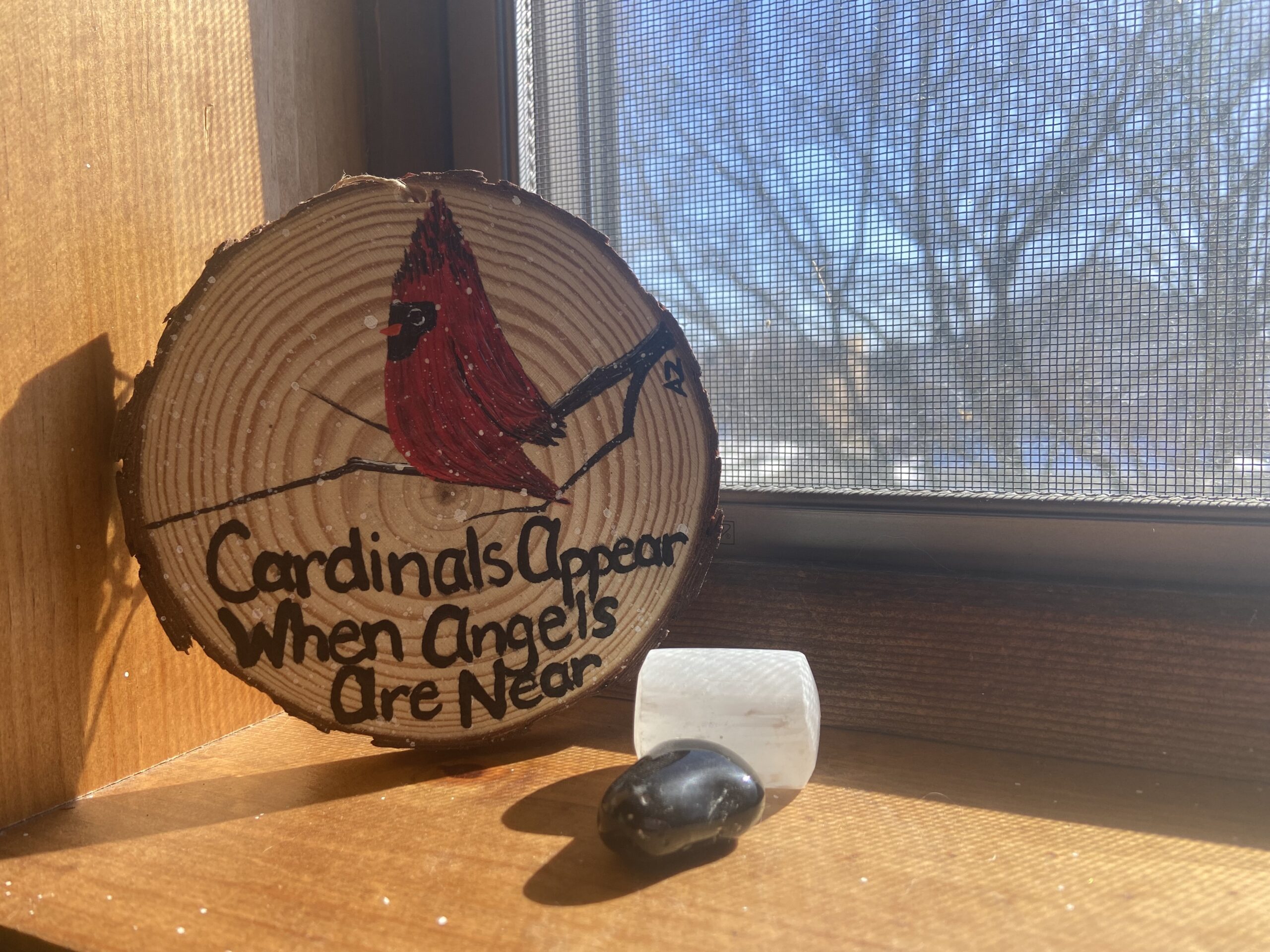 4 inch round hand-painted ornament on wood by Ashlynne (Zankey) Berkebile – memorial cardinal