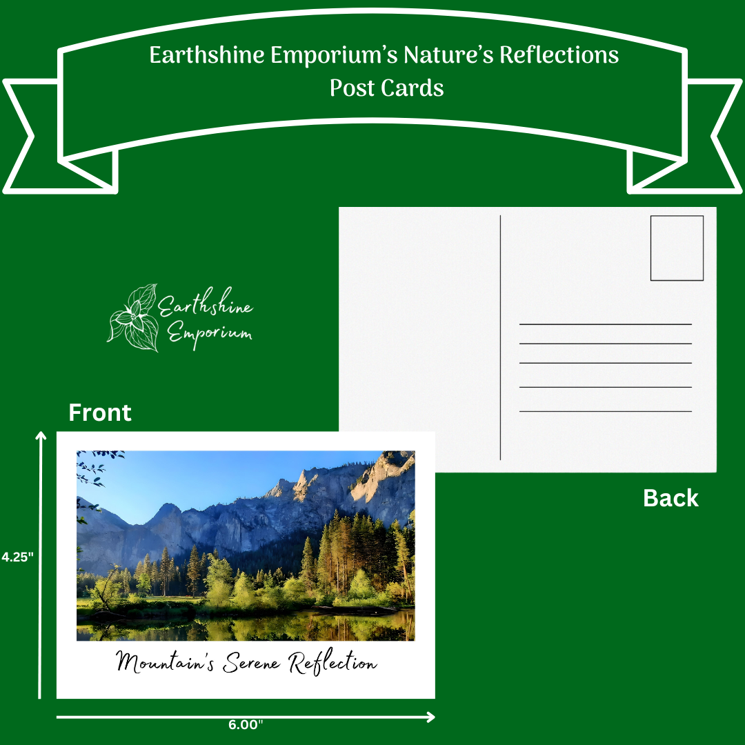 Capture the serene beauty of the natural world with Earthshine Emporium’s Nature’s Reflections postcards. Each 4.25″ x 6″ postcard showcases stunning nature photography, thoughtfully curated to reflect the tranquil moments found in our surroundings. Whether you’re sending a heartfelt message or adding a touch of nature to your collection, these postcards are the perfect way to share the peaceful essence of the outdoors. Printed on high-quality cardstock with vibrant colors, they make an ideal keepsake or gift for nature lovers everywhere.