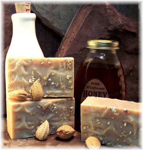 Ingredients: Ingredients: Goat Milk, Olive Oil, Coconut Oil, Tallow, Castor Oil, Sodium Hydroxide, Shea & Cocoa Butters, Oatmeal, Honey, Essential & Fragrance Oils, Mica