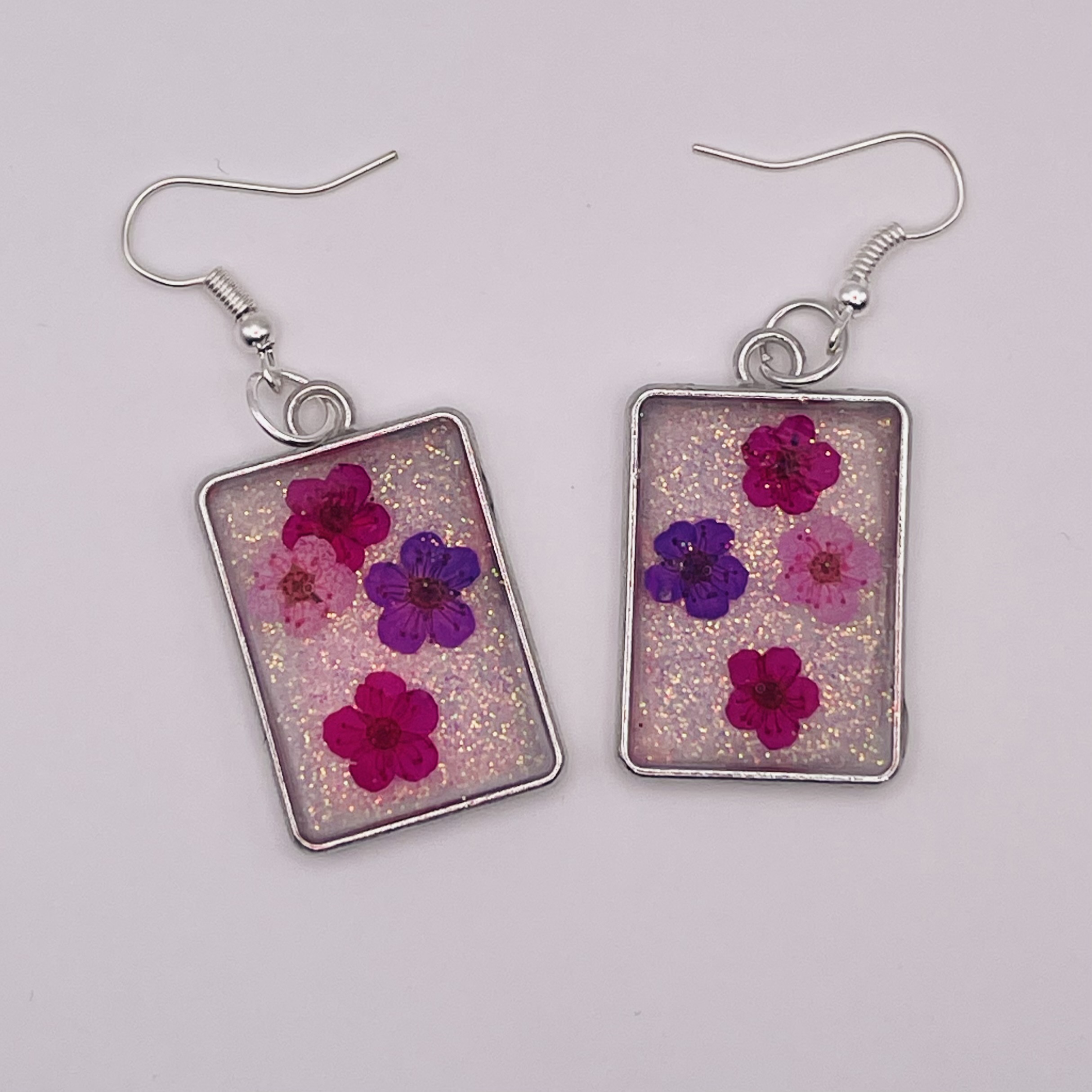 These beautiful earrings are handcrafted from an open back bezel filled with resin mixed with glitter and a variety of pretty pressed flowers.