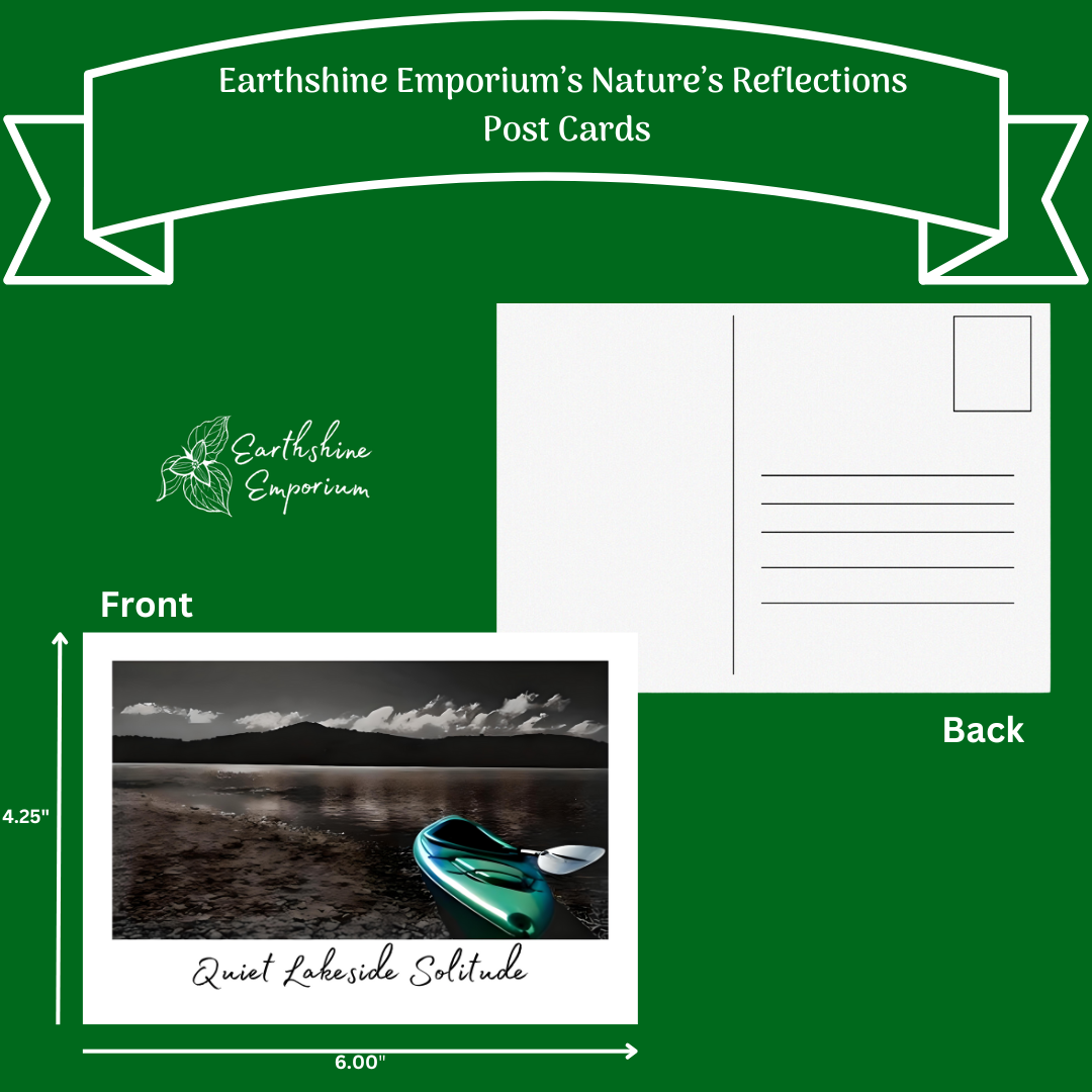 Capture the serene beauty of the natural world with Earthshine Emporium’s Nature’s Reflections postcards. Each 4.25″ x 6″ postcard showcases stunning nature photography, thoughtfully curated to reflect the tranquil moments found in our surroundings. Whether you’re sending a heartfelt message or adding a touch of nature to your collection, these postcards are the perfect way to share the peaceful essence of the outdoors. Printed on high-quality cardstock with vibrant colors, they make an ideal keepsake or gift for nature lovers everywhere.