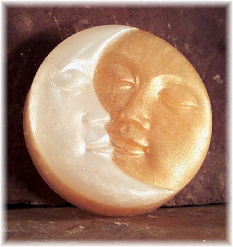Alluring and transcendental best describes this celestial celebration of a heavenly embrace. Hand cast lunar soap, molded in radiant pearly white and shimmering gold or azure blue is a treat for all the senses. Custom orders accepted for gemstone colors, please contact for made to order colors and scents of your choice.