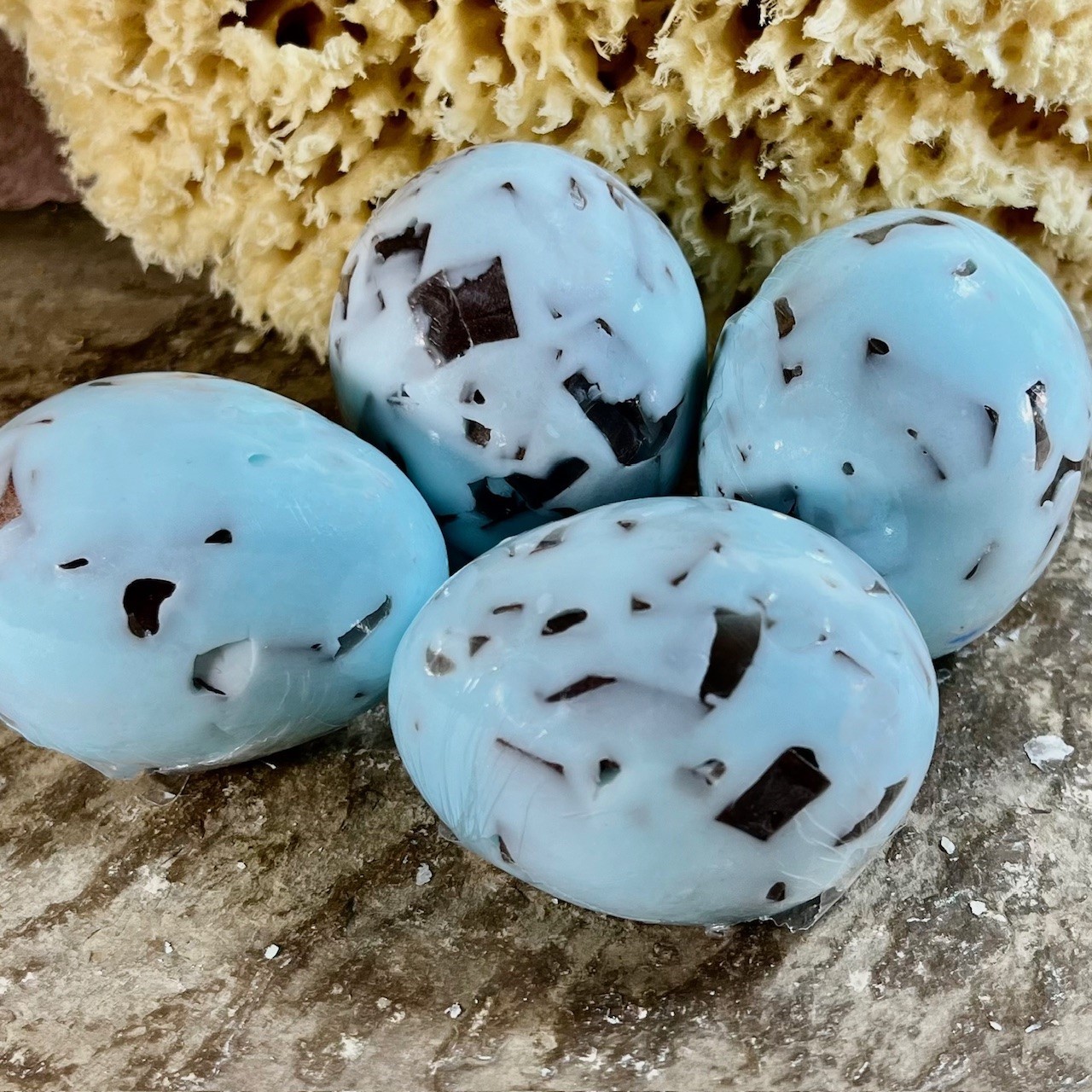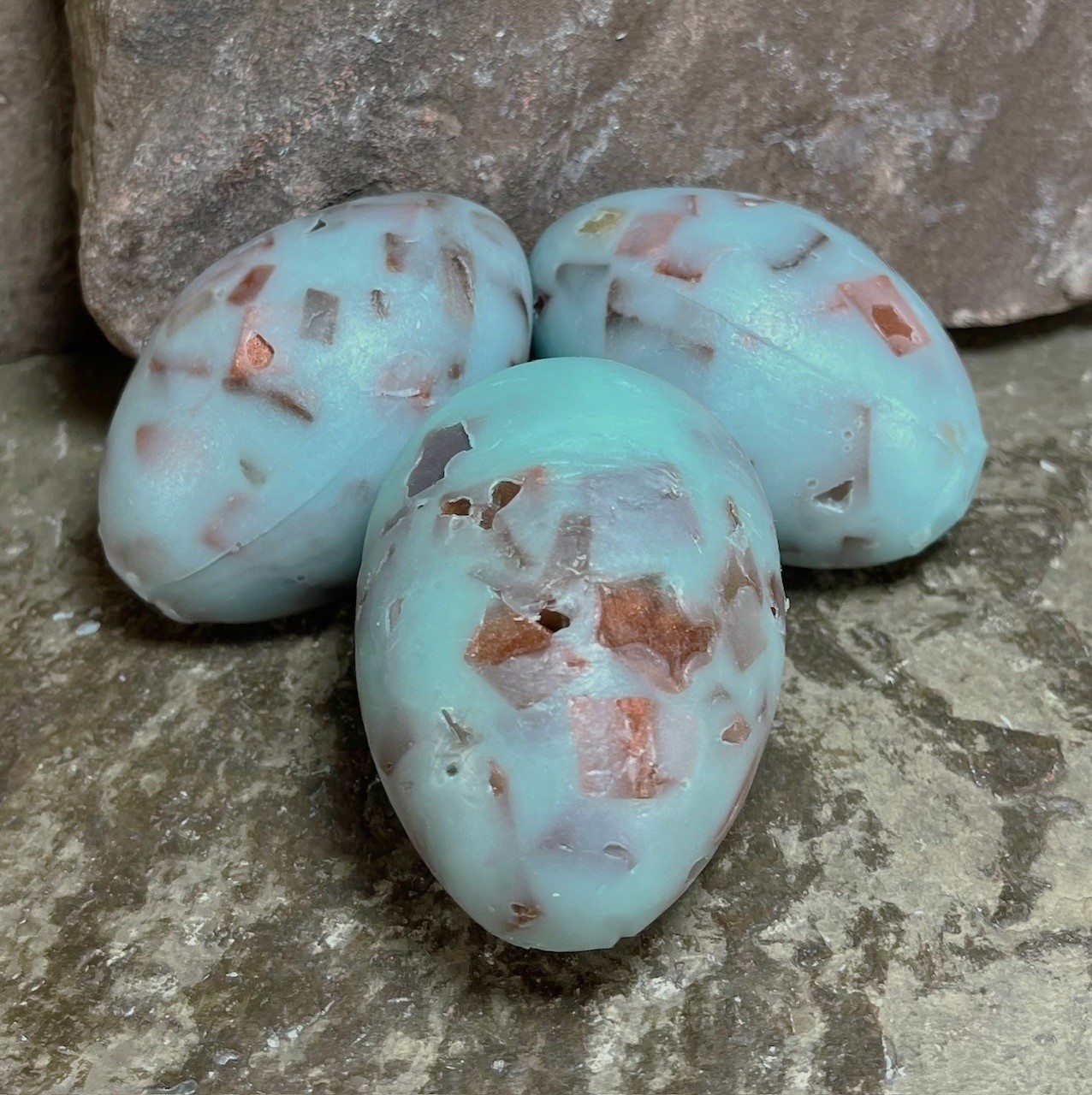 You will be thrilled with the fantastic lather that bubble forth from these soaps that are hand cast in molds created from a real egg. The colors vary from light to medium azure, dusty muted blues or soft aqua green blue with brown and bronze shreds to mimic the forest treasures found in nature. Every one is uniquely handmade resulting in attractive variations creating a one of a kind embellishment for your bath. You can choose between the blue shades or the more natural colors in shades of dusty green/gray/tans. The third photo shows the variety of colors next to each other so you can visualize the shading. If you choose the “set of 4 asst” option you will receive 4 small egg soaps in either robin egg blue, assorted shades of blues or the dusty green/browns.