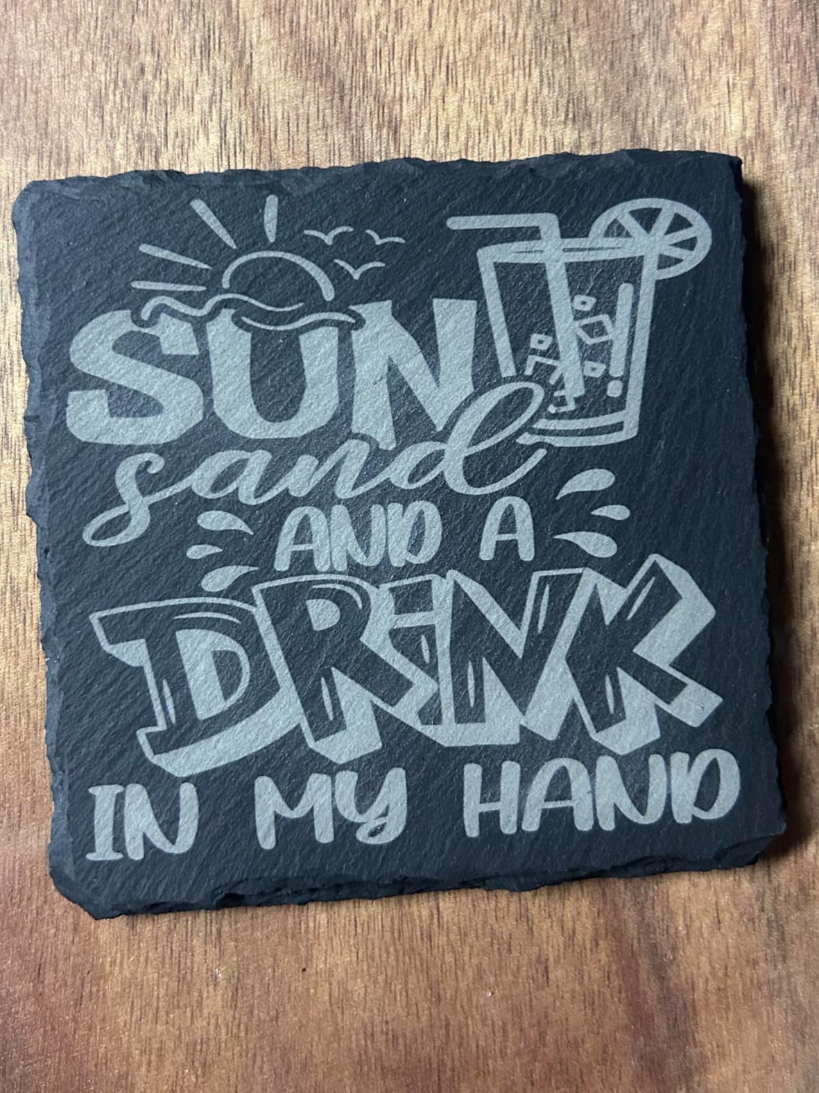 Sun, sand, drink in my hand Slate Coaster. Laser engraved and forever visible.