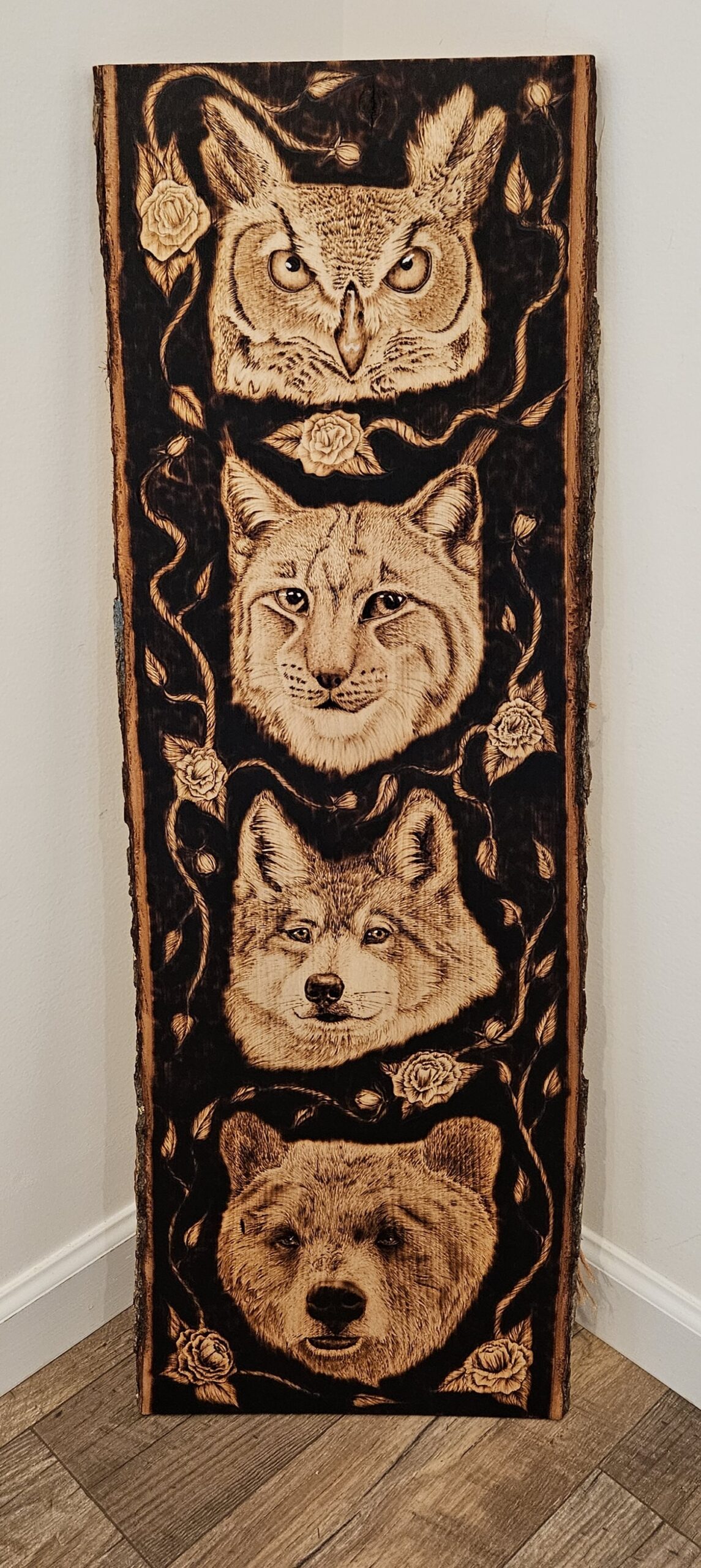 This original piece of artwork was burnt into the piece of wood by hand. The image includes face portraits of an owl, a lynx, a wolf, and a bear. The wood has been sealed with a coat of polyurethane to protect the artwork from UV damage. This piece is approximately 36×12 inches in size.