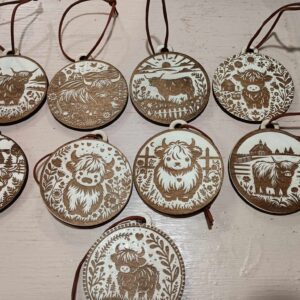 Handcrafted, wooden ornaments carved in various Highland Cow options. Each ornament is about 4 inches tall.